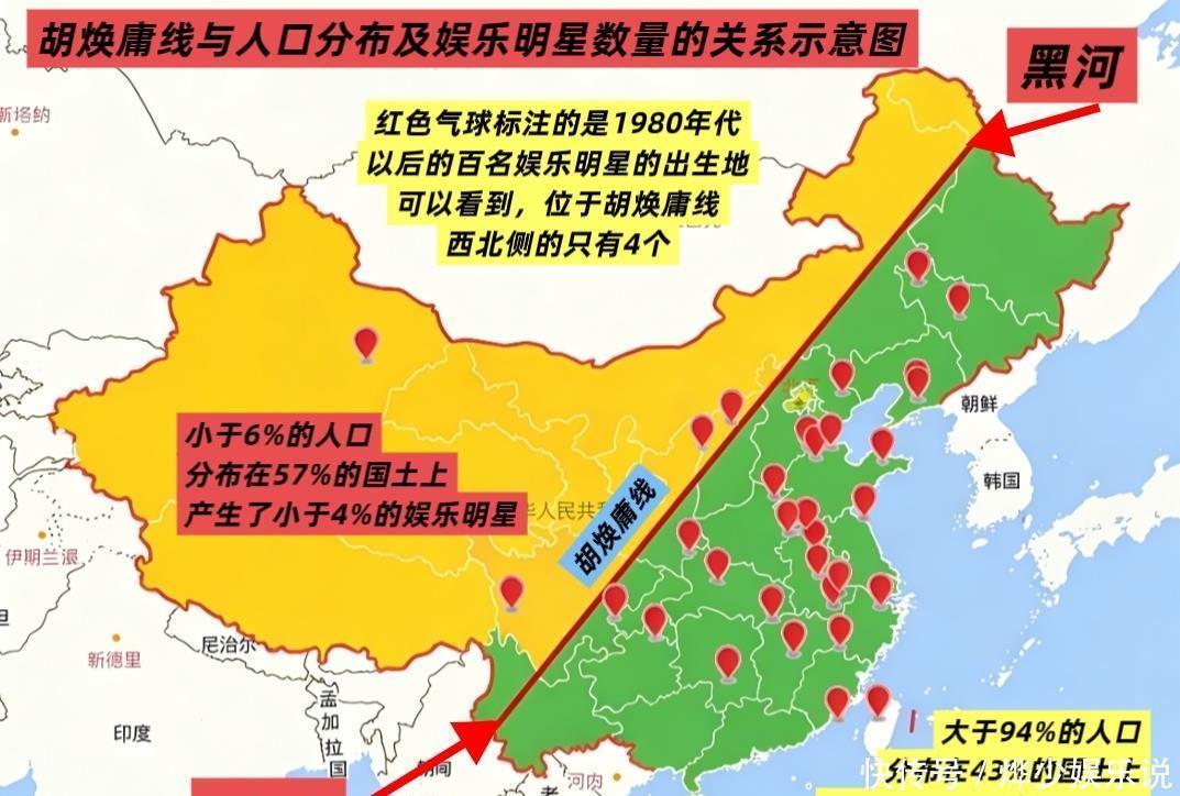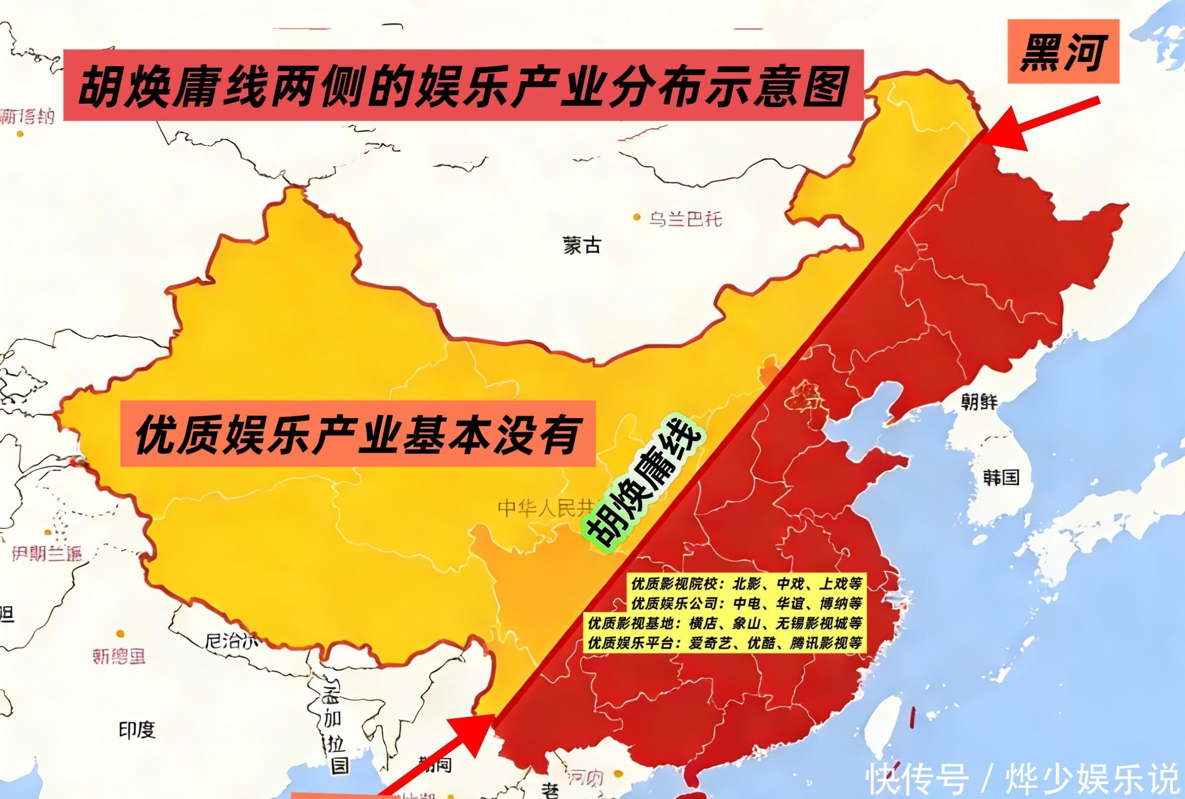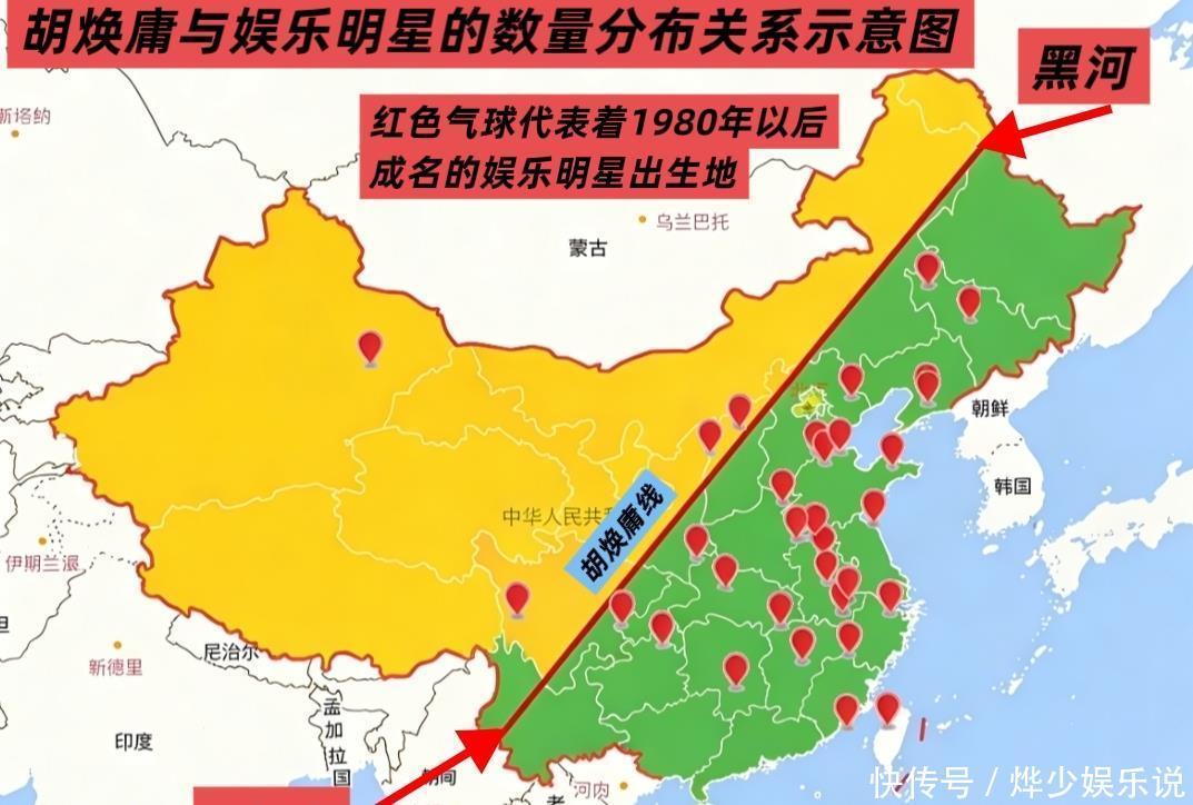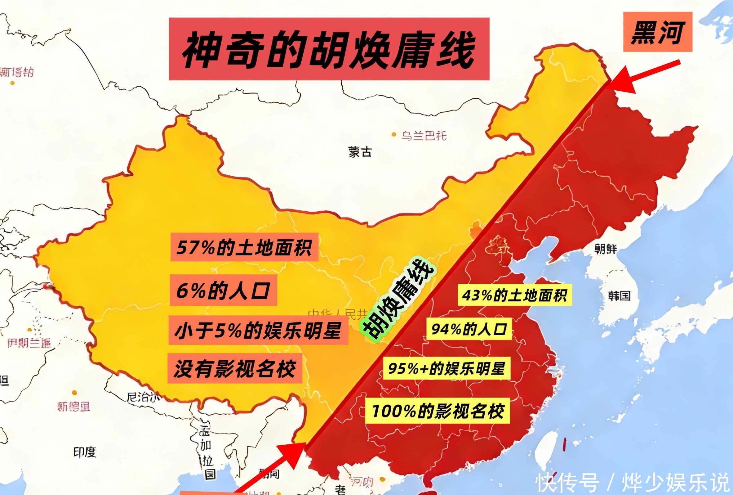 一张中国地图,一条从黑龙江黑河到云南腾冲的斜线,将娱乐圈的残酷现实暴露无遗——这条被称为“胡焕庸线”的地理分界线,竟然也是中国明星资源的“命运分割线”。胡焕庸线东南侧,以约43%的国土面积,聚集了94%的人口,更不可思议地孕育了95%以上的中国主流娱乐明星;而占据国土57%的西北侧,明星比例竟不足5%。
